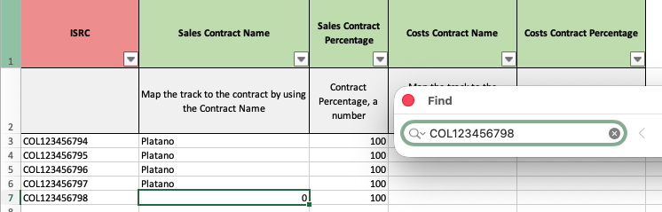 - Apply Correction: Search for the ISRC found in Step 1 within the "Track Rights" tab, and then add a Contract value in the Sales Contract Name column to fix the error.