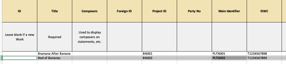 - Entry ID lokaliseren: U moet eerst de Main Identifier/Tunecode van het Work vinden in rij 4 van het eerste tabblad ("Works").