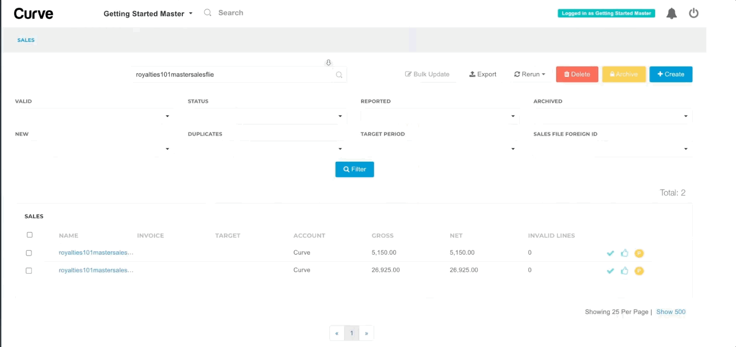 The quickest way to view which lines remain unreported is by exporting the sales file after mappings are created by Curve. To do so, we'd go into the sales file in question, scroll down to the bottom of the page, and click on “Filter”.
