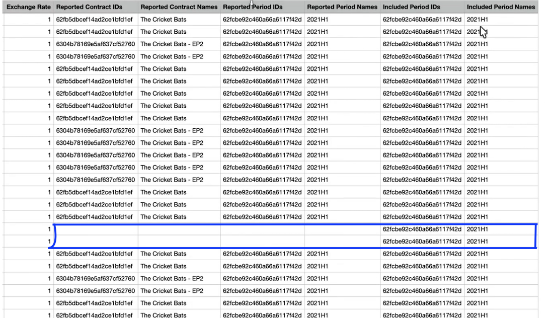 So, if a sales line has been included in a Period but not reported in one, the "Included" fields will be populated, while the "Reported" fields (i.e., "Reported Period IDs" and "Reported Period Names") would be blank.