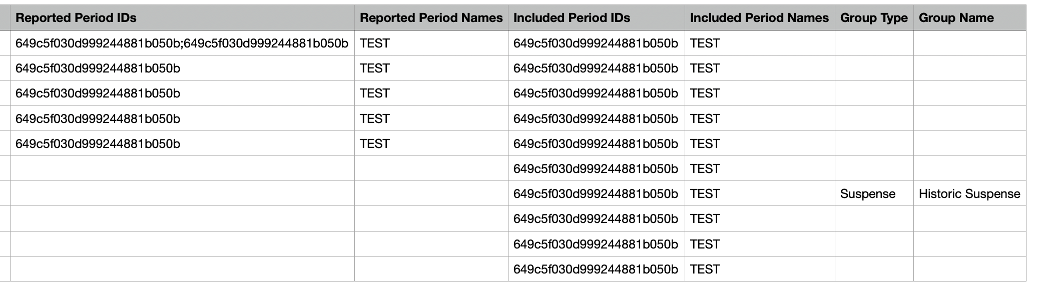 Dus, als een Income regel is opgenomen in een Period, maar niet in één is gerapporteerd, worden de "Included" velden ingevuld, terwijl de "Reported" velden (d.w.z. "Reported Period IDs" en "Reported Period Names") leeg zouden zijn.