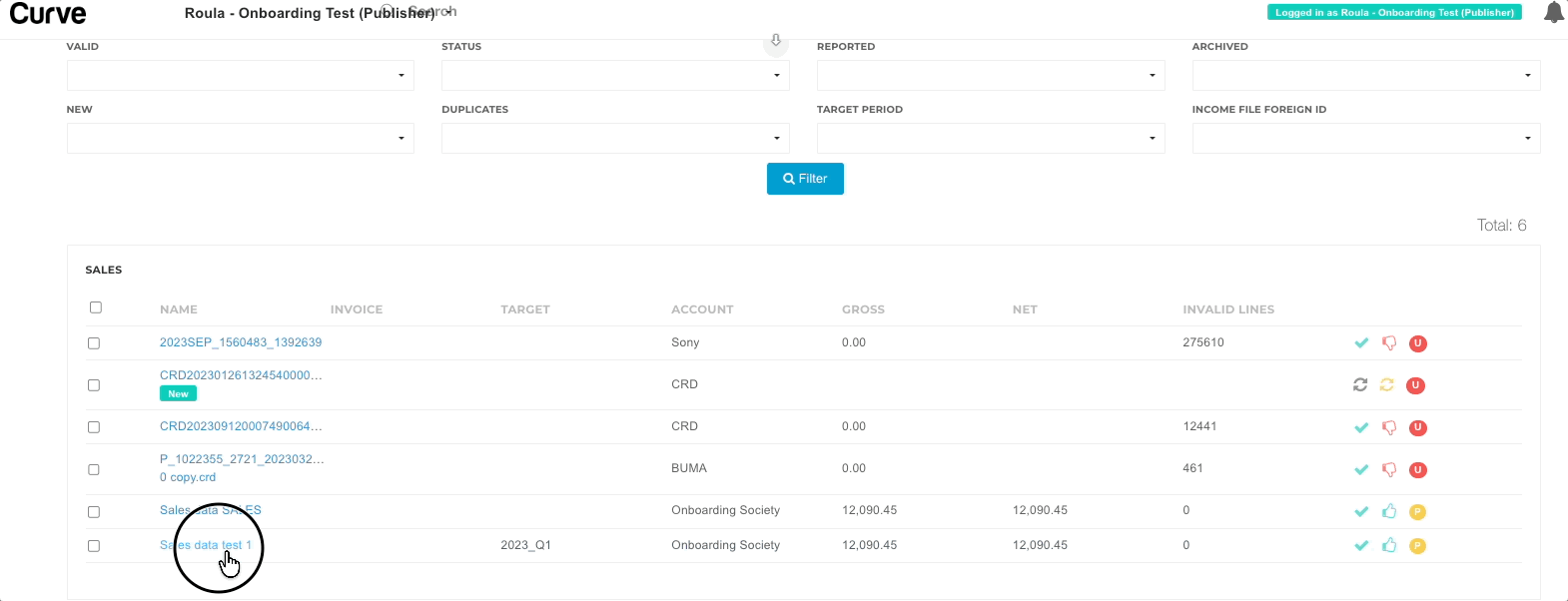 De snelste manier om te bekijken welke regels niet-gerapporteerd blijven, is door het Income File te exporteren nadat mappings zijn gemaakt door Curve. Om dit te doen, gaan we naar het Income File in kwestie, scrollen we naar de onderkant van de pagina en klikken we op “Filter”.